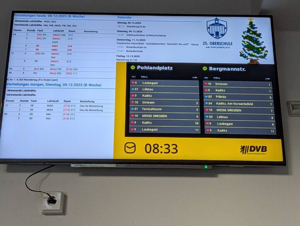 2025 wurde im Erdgeschoss unserer Schule ein Monitor installiert, der aktuelle Informationen zum Vertretungsplan, zu bevorstehenden Terminen und zu Busabfahrten anzeigt.