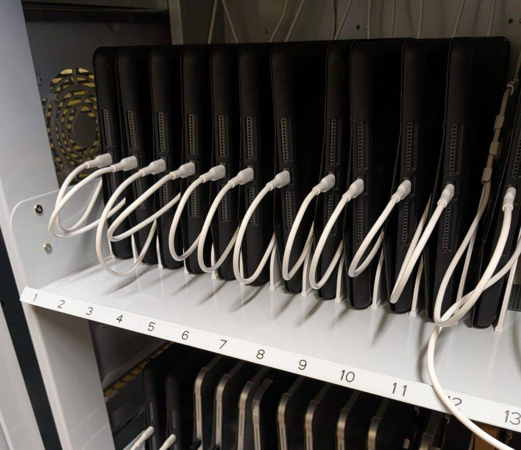 Darüber hinaus verfügt unsere Schule über zwei Sätze iPads, die von den Lehrern bei Bedarf im Unterricht eingesetzt werden können. Diese Geräte sind mit dem WLAN der Schule verbunden und können vom Lehrer überwacht werden.